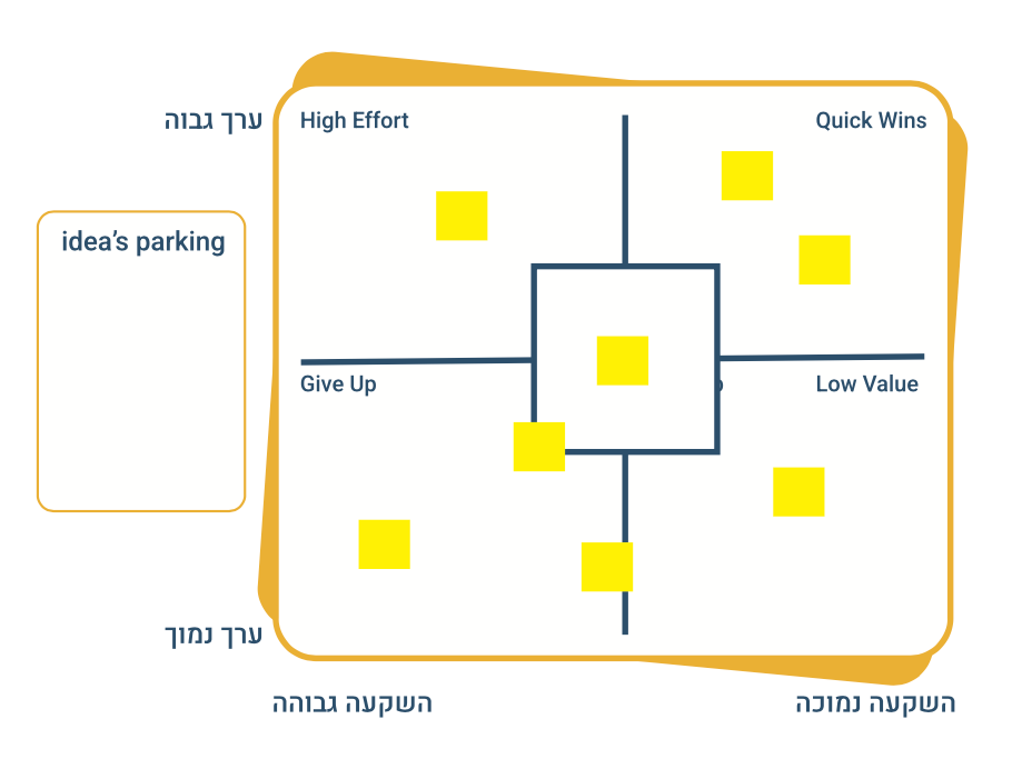 איך? ניקח את כל האפשרויות שברשותנו (שעל פי הסעיף הקודם נבחרו מתוך דביקיות והצבעה ולא מתוך דיון :)) ונעמיד אותם אחד כלפי השני בסקאלה של ערך והשקעה (מצורף תרשים).