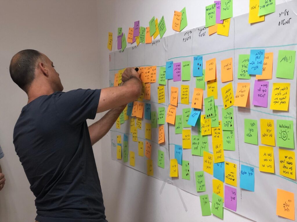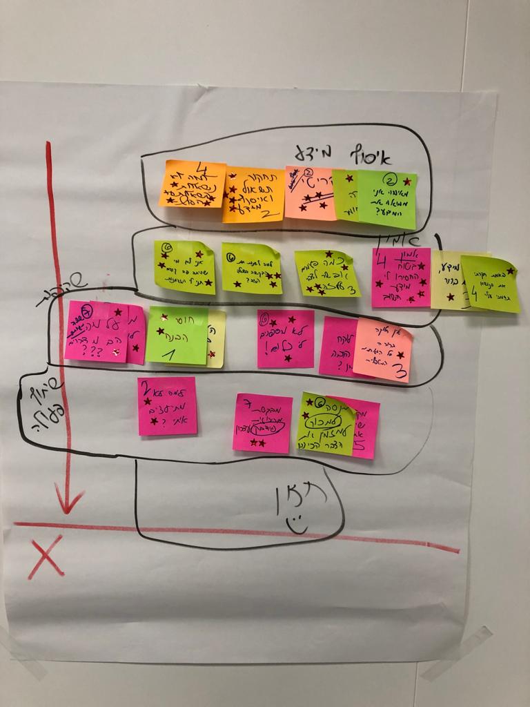 - לאחר ההצבעה נתייחס אך ורק לדביקיות שהצביעו עבורן, נעשה סוג של clustering, כלומר: נחבר דביקיות זהות במשמעות שלהן תחת קטגוריה זהה עם שם ברור ונתעדף אותן. מאלה שקיבלו הכי הרבה מדבקות לאלה שקיבלו הכי מעט. בידינו נכס – רשימת נקודות הפוטנציאל והקטגוריות שלהן שמהם נצמח להגדרת ה OKRs הארגוניים.