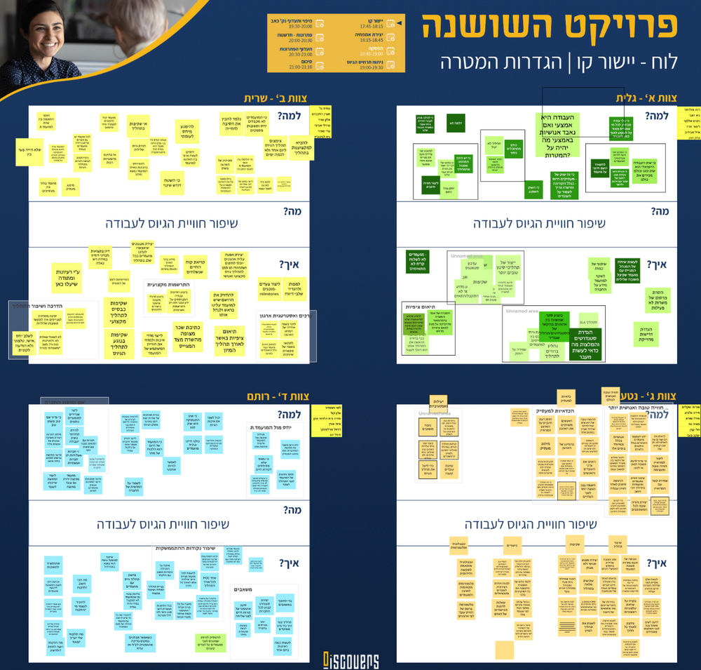 לקחנו את העקרונות של סדנאות Design Thinking, ופיתחנו סדנה מותאמת אישית לאתגר, לזמן שניתן לנו (4 שעות), לכמות המשתתפים והעובדה שהסדנה היא אונליינית.