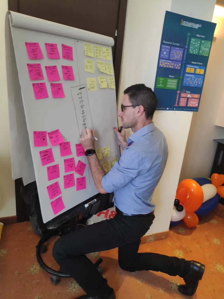 עם סט הפעילויות שאנחנו מעבירים בחלק הזה בסדנא – אנחנו מנתחים יחד את המצב הקיים – אם זה בתוך הארגון או אם זה אצל לקוחותיו. בסוף השלב הזה אנחנו מבינים יחד מהן נקודות הכאב, התסכול, הקשיים והאתגרים של הלקוח ושלנו.