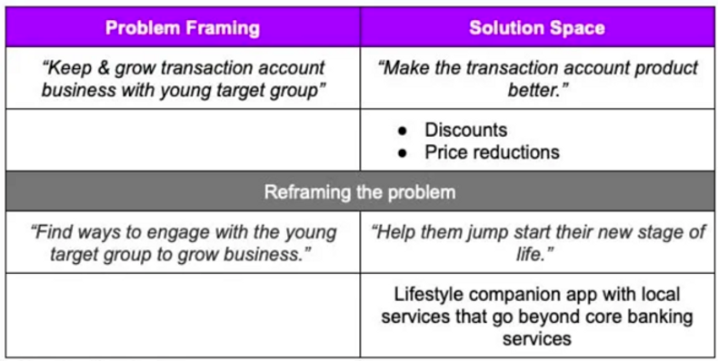 על ידי יישום תהליך ה-Reframing התרחקנו מבעיה ופתרון שהיו משאירים אותנו בשוק החשבונות הפעילים, עם רווחים יורדים בגלל ניסיון להשאיר לקוחות צעירים במוצר חשבון פעיל על ידי הורדת מחירים, והגדרנו בעיה רחבה יותר: התמקדות במציאת דרכים ליצירת קשר עם קבוצת היעד הצעירה.